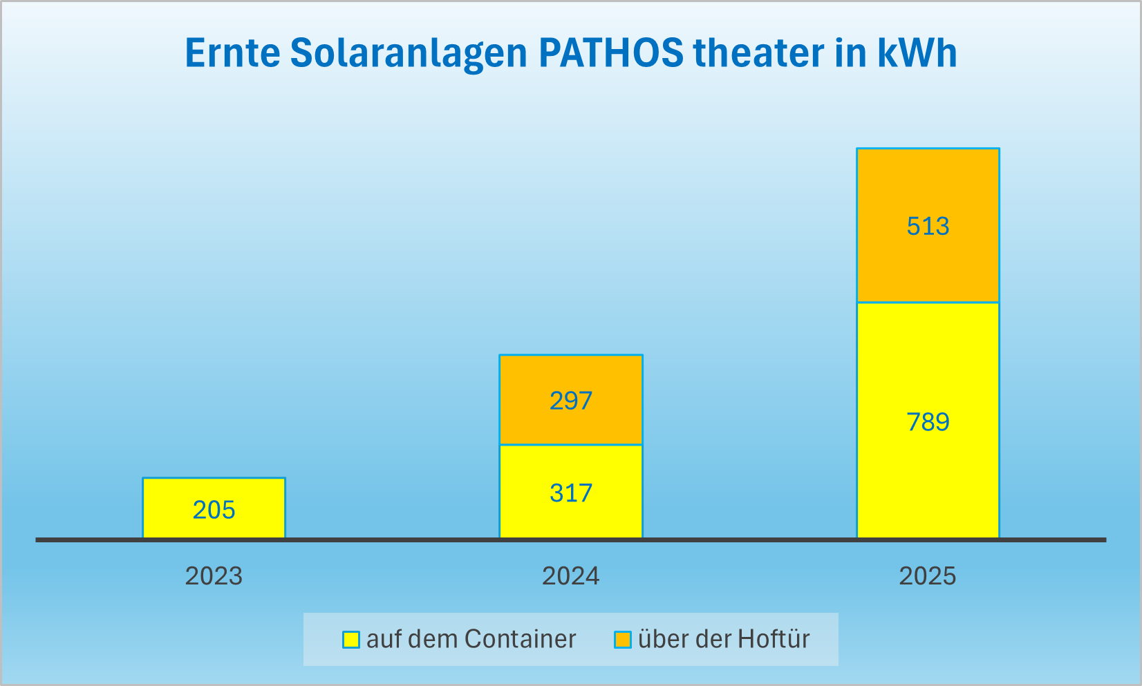 Unsere beiden Stecker-Solaranlagen haben wir 2023 und 2024 in Betrieb genommen, sie produzierten bis Ende 2025 insgesamt 2.122 kWh Strom und deckten damit bspw. 2024 ganze 6,7% Prozent unseres Strombedarfs im PATHOS. Wir freuen uns über diese Art der “Ernte”, die unsere Grundlast an Kühlschränken und Technik-Servern tagsüber zuverlässig abdeckt.