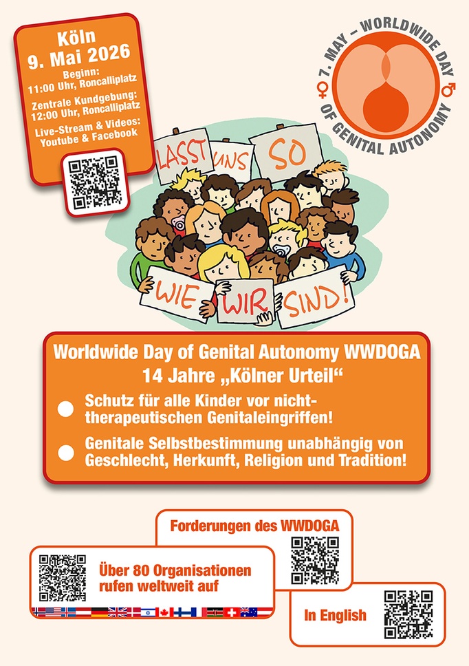 Am 07. Mai jährt sich die Verkündung des "Kölner Urteils" zum vierzehnten Mal. Dieses hatte 2012 auch Jungen das Recht auf genitale Selbstbestimmung zugesprochen, indem es eine medizinisch nicht indizierte Vorhautentfernung („Beschneidung“) eines Jungen als eine strafbare Körperverletzung bewertete. Inzwischen ist der 07. Mai längst weltweit zu einem Symbol für die Selbstbestimmungsrechte des Kindes unabhängig von Geschlecht, Herkunft, Religion und Tradition geworden.